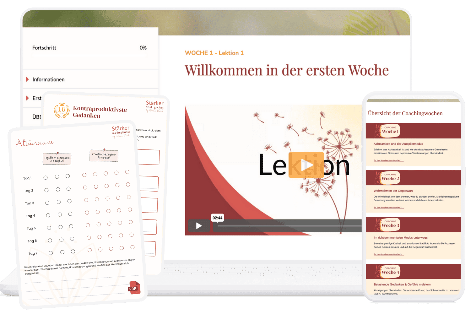 Deine Mitgliedschaft in Stärker als du glaubst beginnt mit einem 12-wöchigen Basis-Coaching. Hier lernst du durch die Praxis der Achtsamkeit, die Prozesse in deinem Bewusstsein zu erkennen, zu verstehen und zu steuern. Vom Opfer unbewusster Denkmuster und Verhaltensweisen wirst du zum bewussten Schöpfer deines Lebens.